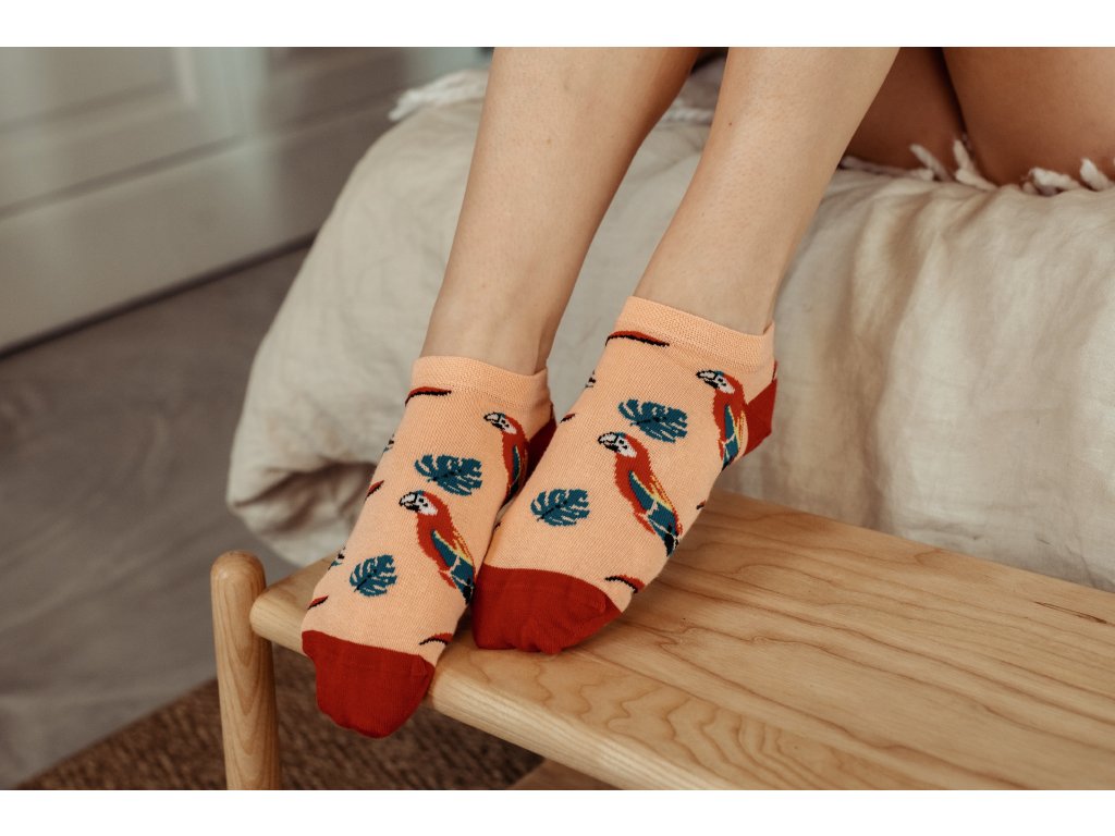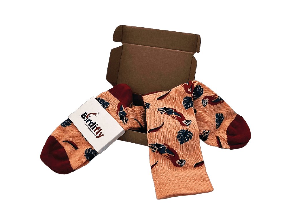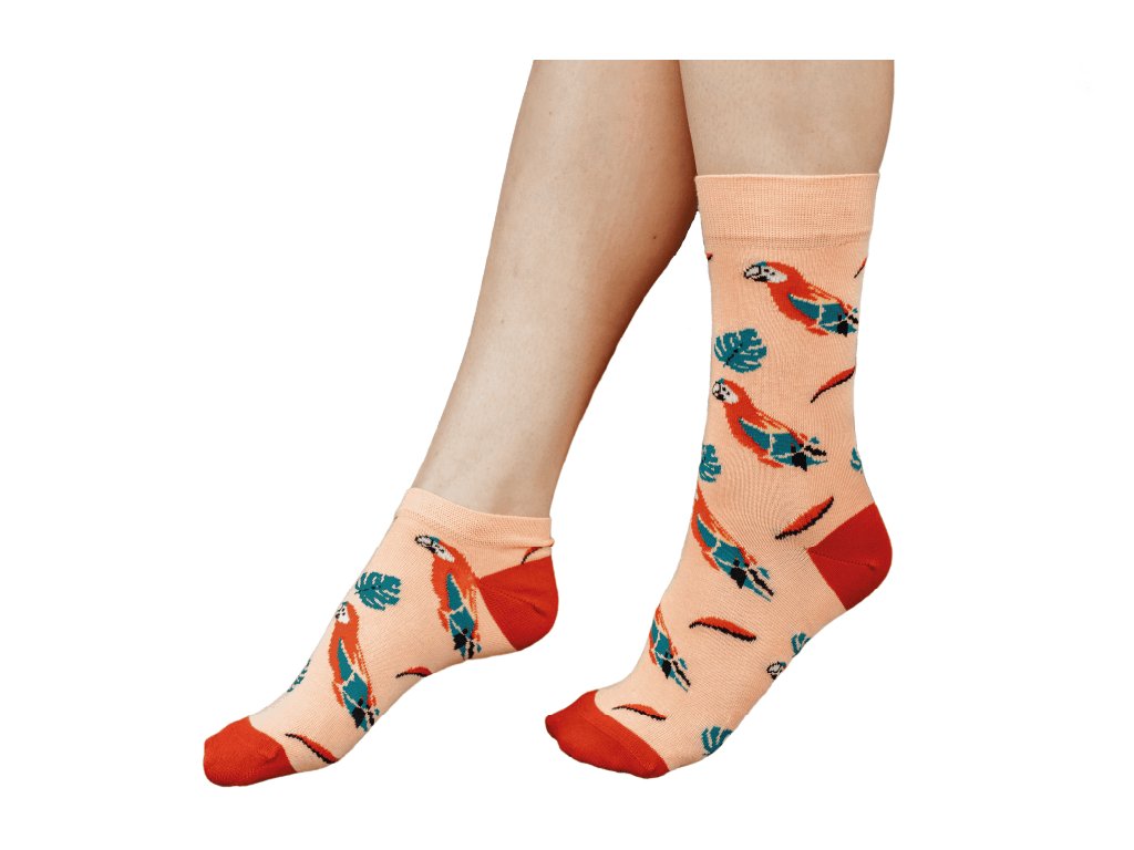 Pokud jste chovatel exotického ptactva a hledáte originální dárek pro sebe nebo někoho ze svého okolí, můžeme Vám doporučit tyto ponožky v designu ara arakanga. Jedná se o pohodlné a kvalitní ponožky s měkkým lemem v červené/oranžové barvě se vzorem papoušků ara, které byly vyrobeny v ČR. Můžete si vybrat z různých velikostí (36-40 a 41-46) a střihů (kotníkové nebo klasické ponožky). Udělejte radost sobě i okolí při pohledu na podařeně zpracovaný design našich ponožek!