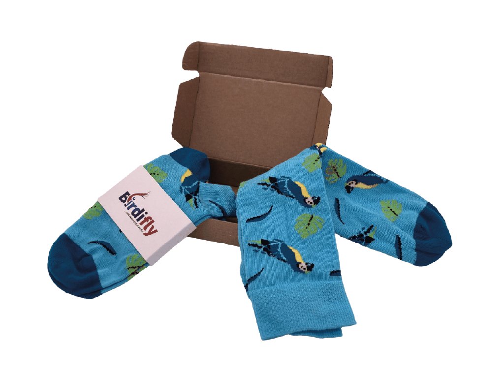 Pokud jste chovatel exotického ptactva a hledáte originální dárek pro sebe nebo někoho ze svého okolí, můžeme Vám doporučit tyto ponožky v designu ara ararauna. Jedná se o pohodlné a kvalitní ponožky s měkkým lemem v modré barvě se vzorem papoušků ara, které byly vyrobeny v ČR. Můžete si vybrat z různých velikostí (36-40 a 41-46) a střihů (kotníkové nebo klasické ponožky). Udělejte radost sobě i okolí při pohledu na podařeně zpracovaný design našich ponožek!