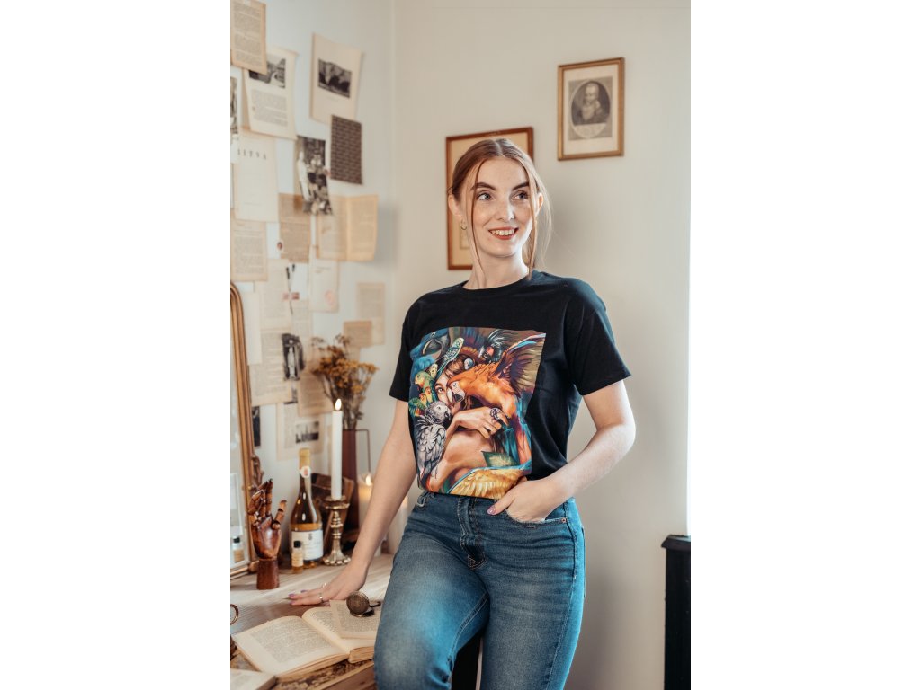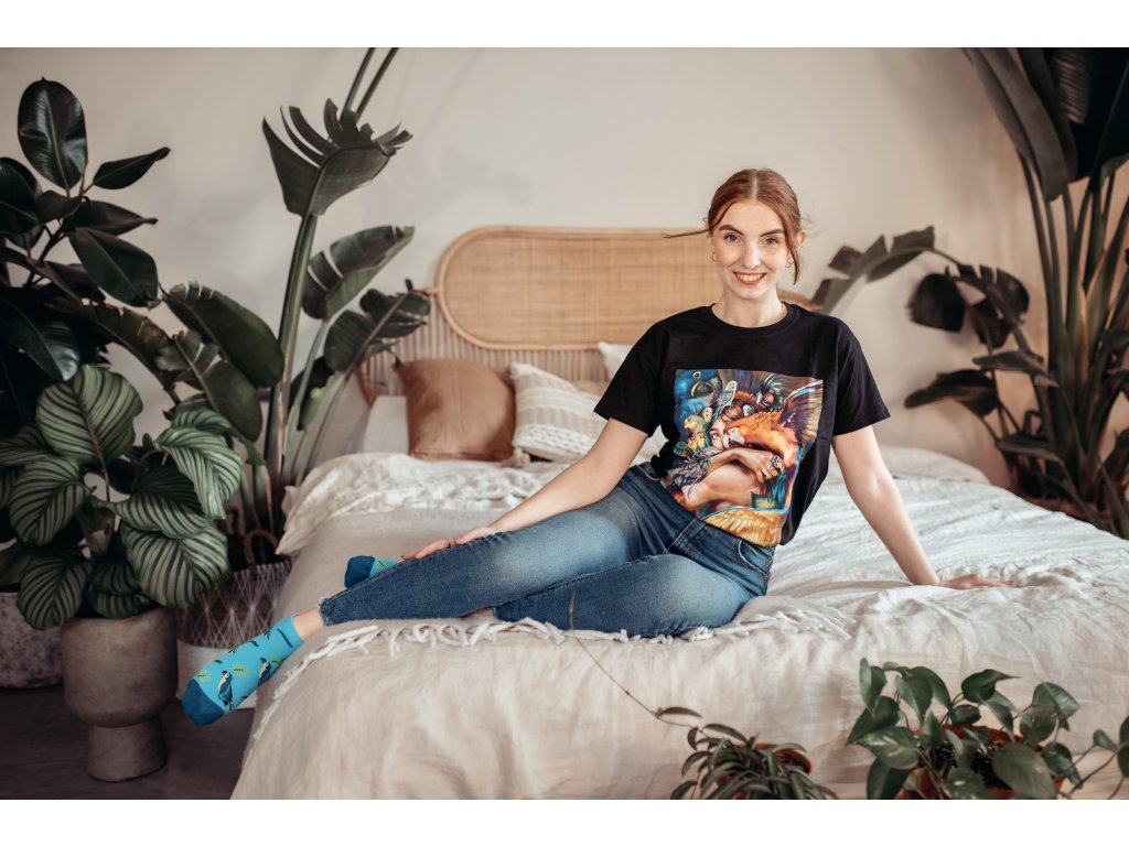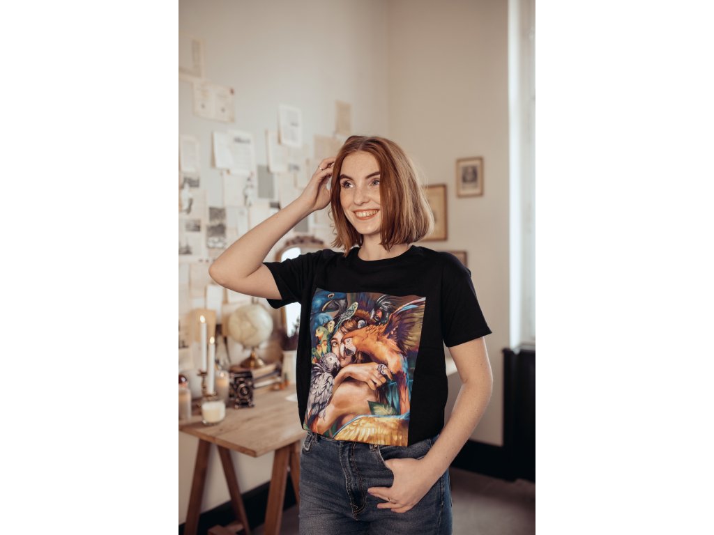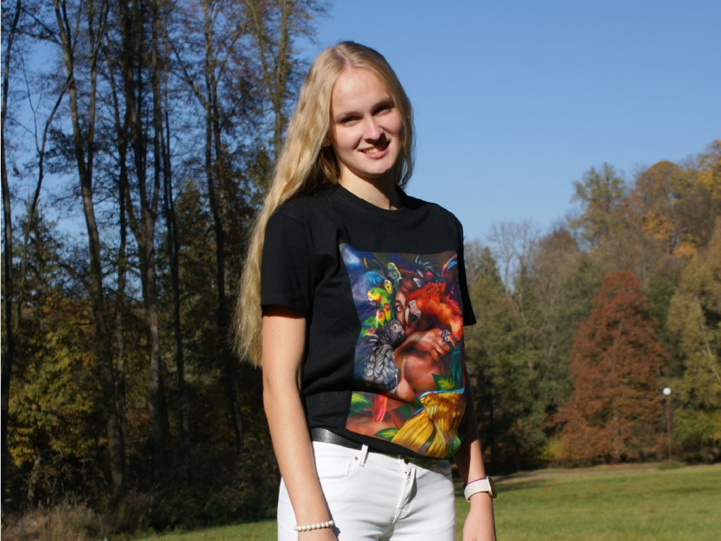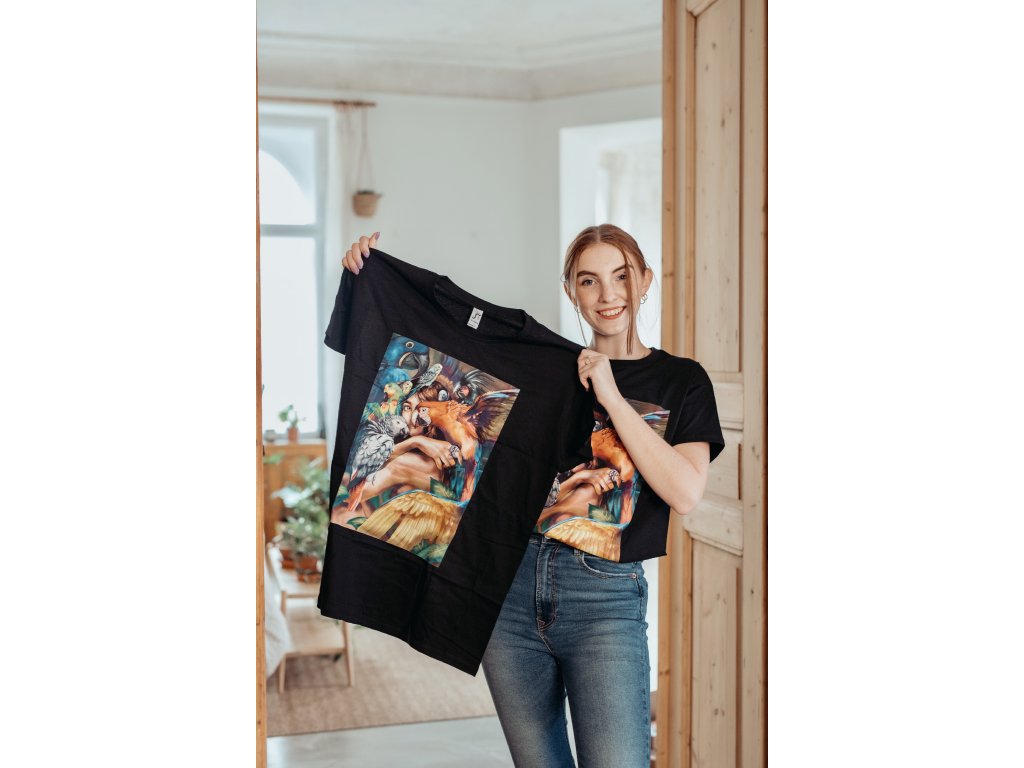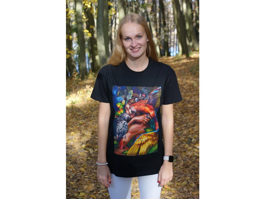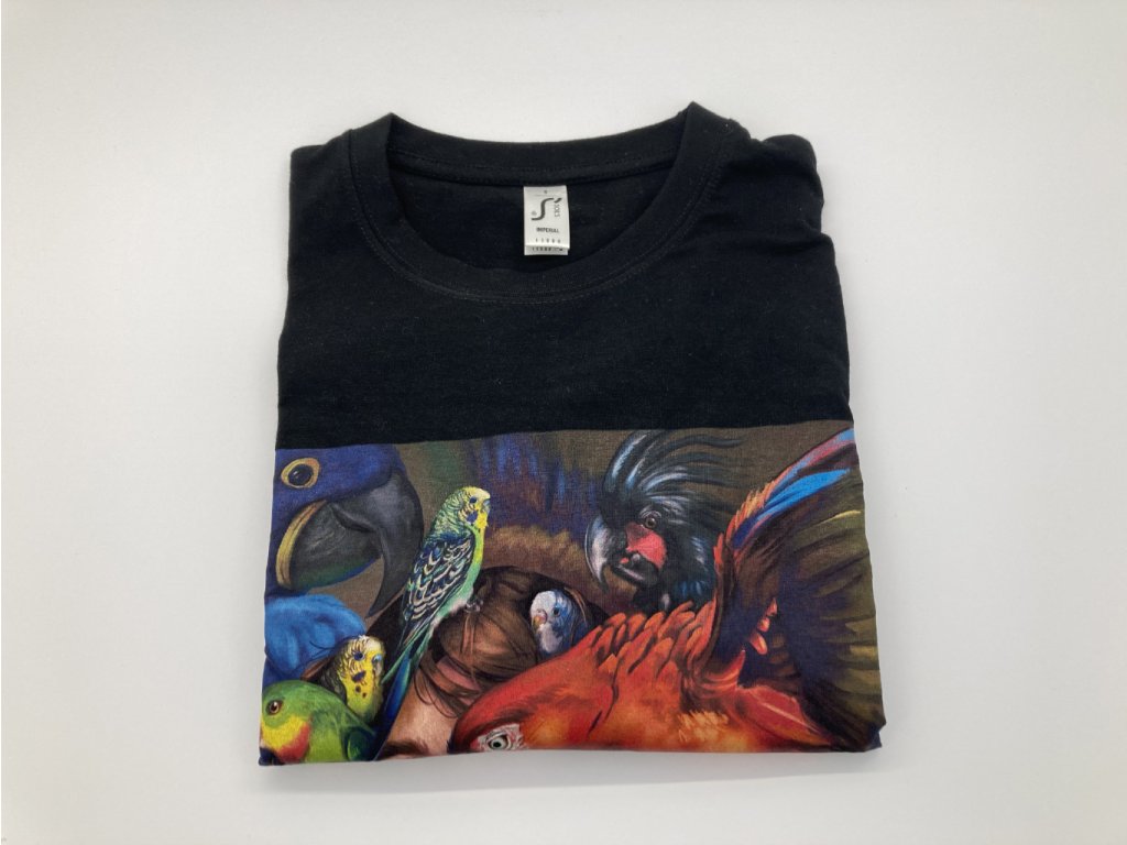 Originální a stylový dárek pro Vás nebo Vaše blízké? Pak jistě zaujme naše černé bavlněné tričko s barevným potiskem papoušků. Jedná se o kvalitní a pohodlné tričko vyšší gramáže s velmi kvalitním potiskem ilustrace od české designérky. Toto tričko jednoduše nesmí chybět v žádném chovatelském šatníku. Vybírejte z pěti velikostí (S, M, L, XL, XXL) a udělejte radost sobě anebo svým známým!